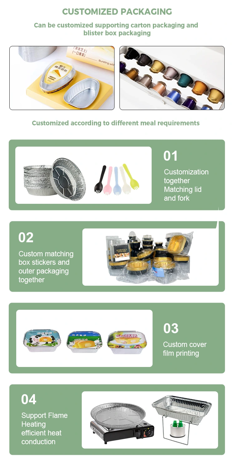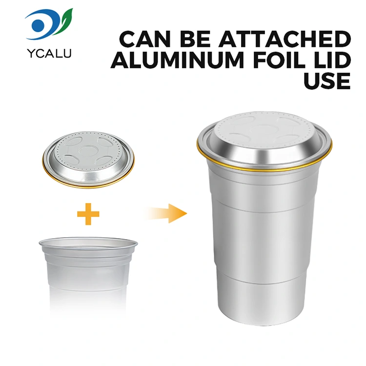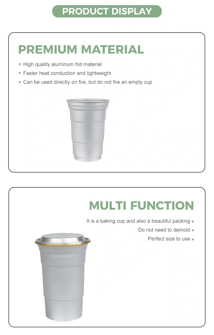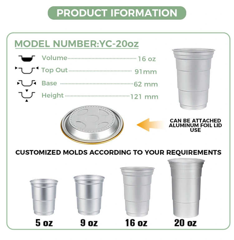 На відміну від звичайних контейнерів, одноразові чашки для напоїв із алюмінієвої фольги Yunchu на 16 унцій спеціально розроблені, щоб забезпечити пакувальні рішення для брендів у конкретних сценаріях. Завдяки компактному розміру (460 мілілітрів) ця настроювана одноразова чашка для напоїв з алюмінієвої фольги об’ємом 16 унцій на замовлення відповідає звичкам споживання одноразових розчинних напоїв. Ці індивідуальні одноразові вечірні чашки з алюмінієвої фольги на 16 унцій особливо підходять для виносу, ринків або кемпінгу, крім його практичних функцій. Перш за все, це може допомогти підвищити вартість бренду.