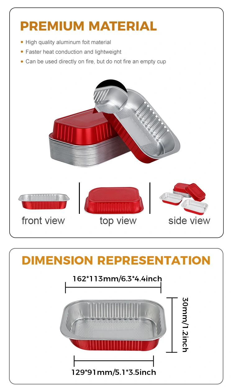 -Матеріал Rectangle Red Aluminium Take Out Container може зафіксувати свіжість і свіжість їжі. Його чудові теплопровідні та ізоляційні властивості дозволяють безпосередньо нагрівати його в духовці, мікрохвильовій печі та охолоджувати в холодильнику, ефективно зберігаючи оригінальний смак страви та зберігаючи ідеальний смак протягом тривалого часу.