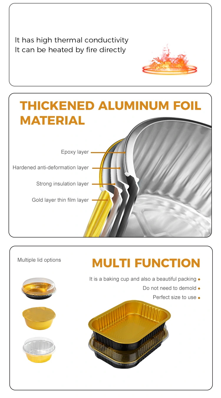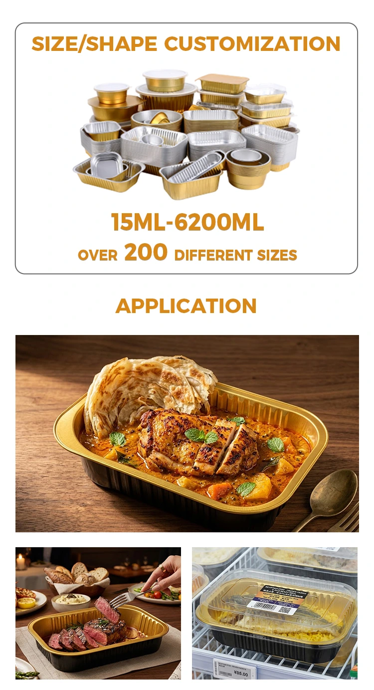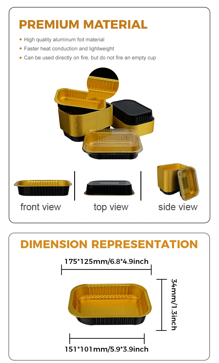 Одноразові прямокутні контейнери з алюмінієвої фольги Yunchu, виготовлені з алюмінієвої фольги для харчових продуктів. Вони пройшли сувору обробку та перевірку, не мають специфічного запаху. Весь виробничий процес відбувається в чистому цеху без пилу без будь-яких шкідливих добавок. Рис, м'ясо, суп і т.д. також можуть безпосередньо контактувати. Цей контейнер з алюмінієвої фольги пройшов сертифікацію харчових продуктів США FD A відповідно до стандартів FDA. Після професійного випробування кількість міграції алюмінію значно нижча за вказану межу, і випробування відповідає стандартам. Ми отримали офіційний протокол випробувань. Він не тільки може використовуватися у вітчизняному громадському харчуванні, але й повністю відповідає вимогам для експорту за кордон. Подвійна гарантія, незалежно від того, чи це мережа закладів швидкого харчування, приватна кухня чи міжнародні торговці на винос, її можна використовувати. Вона надійна та може легко витримувати екстремальні перепади температур від -20°C до 250°C. Від охолодження в холодильнику та зберігання в заморозці до мікрохвильового нагрівання, випікання в духовці та навіть нагрівання відкритим вогнем (потрібні теплоізоляційні інструменти), його можна використовувати для упаковки гарячого супу та гарячих страв на винос. Навіть якщо він буде зберігатися в теплі протягом тривалого часу, контейнер не розм'якшиться і не деформується, не розплавиться і не виділить шкідливих газів; після того, як споживачі отримають їжу, їм не потрібно міняти ємність, а поставити її безпосередньо в мікрохвильову піч для розігріву. Крім того, він рівномірно проводить тепло, тому не буде локального перегріву або захоплення їжі під час нагрівання. Він може максимально зберегти смак страви. Незалежно від того, чи це запечений рис, чи тушковане м’ясо, чи шашлик, чи запечені напівфабрикати, він підходить для упаковки.
