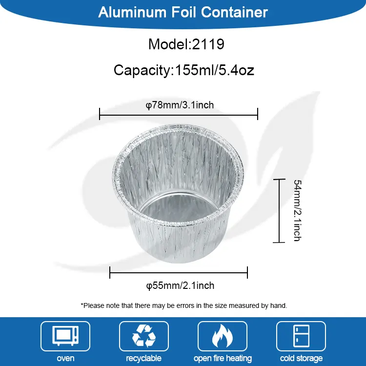 Одноразовий круглий сріблястий контейнер із алюмінієвої фольги від виробника Yunchu із круглої чашки для торта виготовлено з харчової алюмінієвої фольги високого ступеня чистоти. Він пройшов сувору перевірку якості, не має запаху та шкідливих добавок. Прямий контакт з інгредієнтами забезпечує більше душевного спокою, захищаючи кожен шматочок солодкості та здоров’я. Процес потовщення алюмінієвої фольги створює міцний корпус чашки, який нелегко деформувати або зламати. Його можна використовувати для різноманітних тіст для тортів, мусу, пудингу та інших інгредієнтів. Він може витримувати високі температури до 250°C і низькі температури до -20°C для духовок, холодильників, фритюрниць та інших приладів. Його можна добре адаптувати до випікання, охолодження та заморожування. Немає потреби замінювати коробку з алюмінієвої фольги, і немає надто багато втомливих кроків. Класичний круглий дизайн, корпус чашки круглий і гладкий, а відповідний сріблястий металевий блиск не потребує додаткового декору. Його можна подавати відразу після випічки, і це матиме ефект презентації на рівні десертної. Горловина чашки дрібно вигнута, що робить її гладкою на дотик і не дряпає руки. Це запобігає витіканню тіста під час заливання та полегшує виймання з форми.