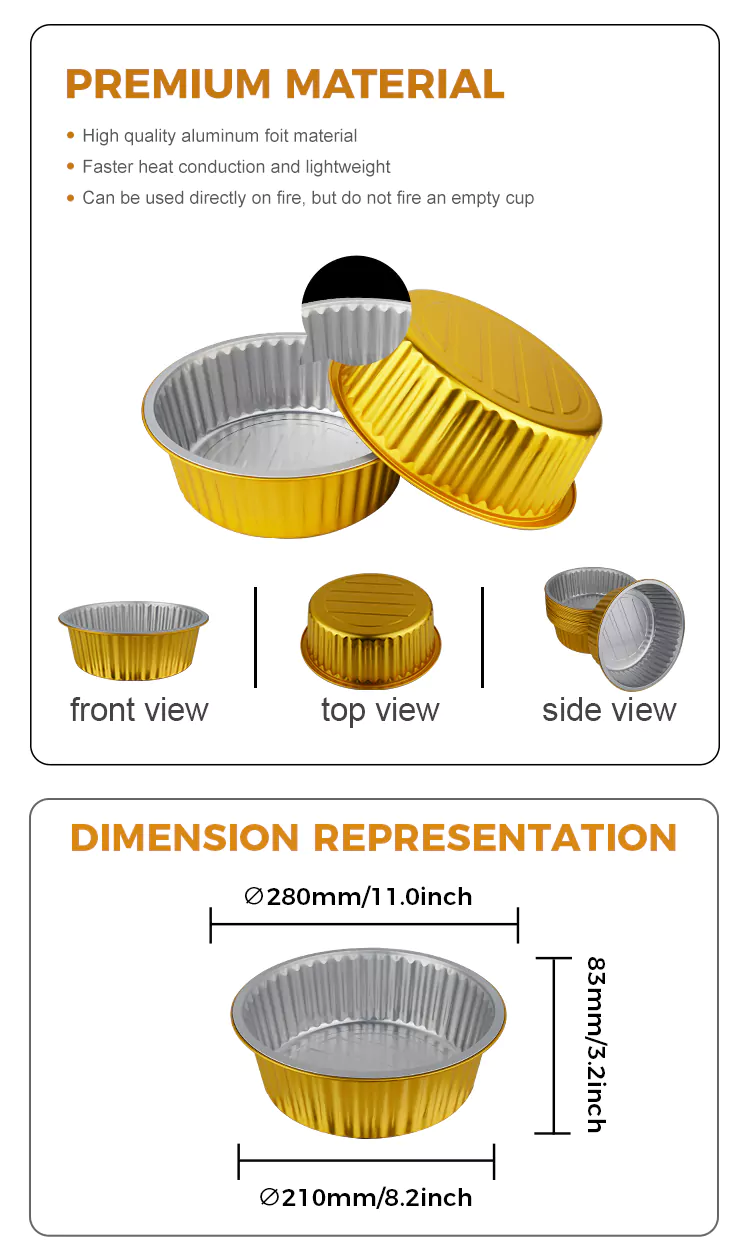 Чудова теплопровідність є однією з основних переваг одноразових круглих контейнерів з алюмінієвої фольги із золота великої ємності. Алюмінієва фольга швидко і рівномірно проводить тепло. Незалежно від того, запікається вона в духовці, розігрівається на відкритому вогні чи в мікрохвильовій печі, вона може забезпечити рівномірне нагрівання їжі, скоротити час приготування та зберегти оригінальний смак інгредієнтів. Кругла конструкція є більш сприятливою для циркуляції тепла. У поєднанні з кришкою з алюмінієвої фольги, що закривається, вона може не тільки запобігти втраті вологи, але й забезпечити комплексне збереження та нагрівання. Під час доставки на винос він може ефективно зберігати їжу теплою, дозволяючи споживачам насолоджуватися гарячою їжею в будь-який час.