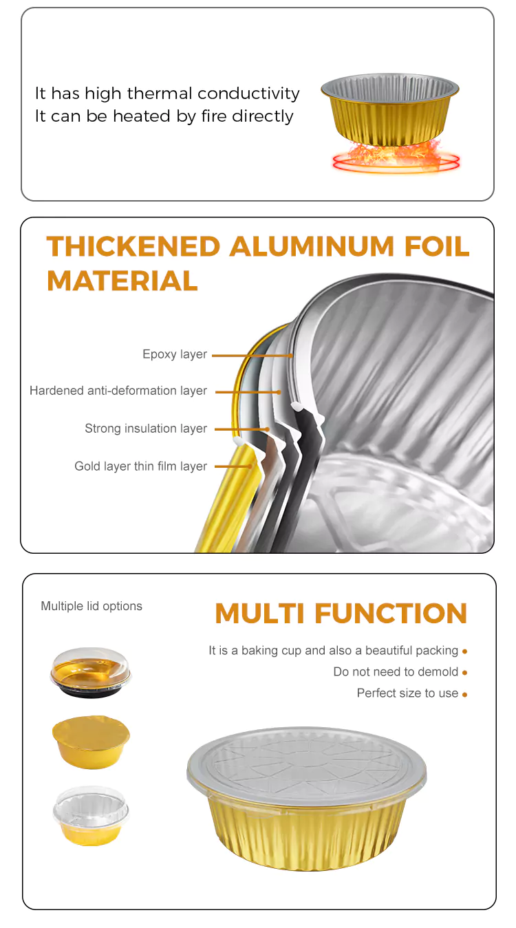 • Одноразові круглі золоті контейнери з алюмінієвої фольги великої місткостіОдноразові круглі золоті контейнери з алюмінієвої фольги великої місткості