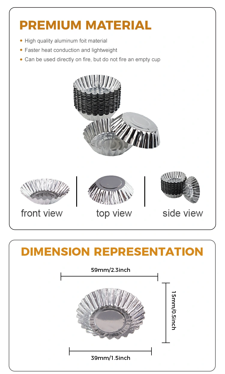 Алюмінієвий яйце з алюмінієвим яєчним тостом випічка сріблястої алюмінієвої фольги з їжею продукту для їжі оптом, призначеним для яєчних пирогів та інших десертів. Він виготовлений з алюмінієвої фольги, яка є безпечною та нетоксичною, і має хорошу теплопровідність, гарантуючи, що їжа була рівномірно і має кращий смак під час процесу випічки. This egg tart tray is versatile and suitable for various occasions such as family gatherings, business events, etc. Easy to remove the mold at high temperature when using, after the finished product is completed, easy to remove the film, non-stick bottom, do not damage the shape, thicken and harden the material that is not easy to deform, good pressure resistance, say goodbye to the trouble of washing the pot and easily protect the pot, isolate oil stains without cleaning after use, smooth bottom is not easy to Скокор і прилипають до дна, антипригарна їжа легко готувати, дно гладке, може витримати -20 ° C ~ 300 ° C, можна нагрівати над відкритим полум'ям, а форма нагрівається рівномірно.