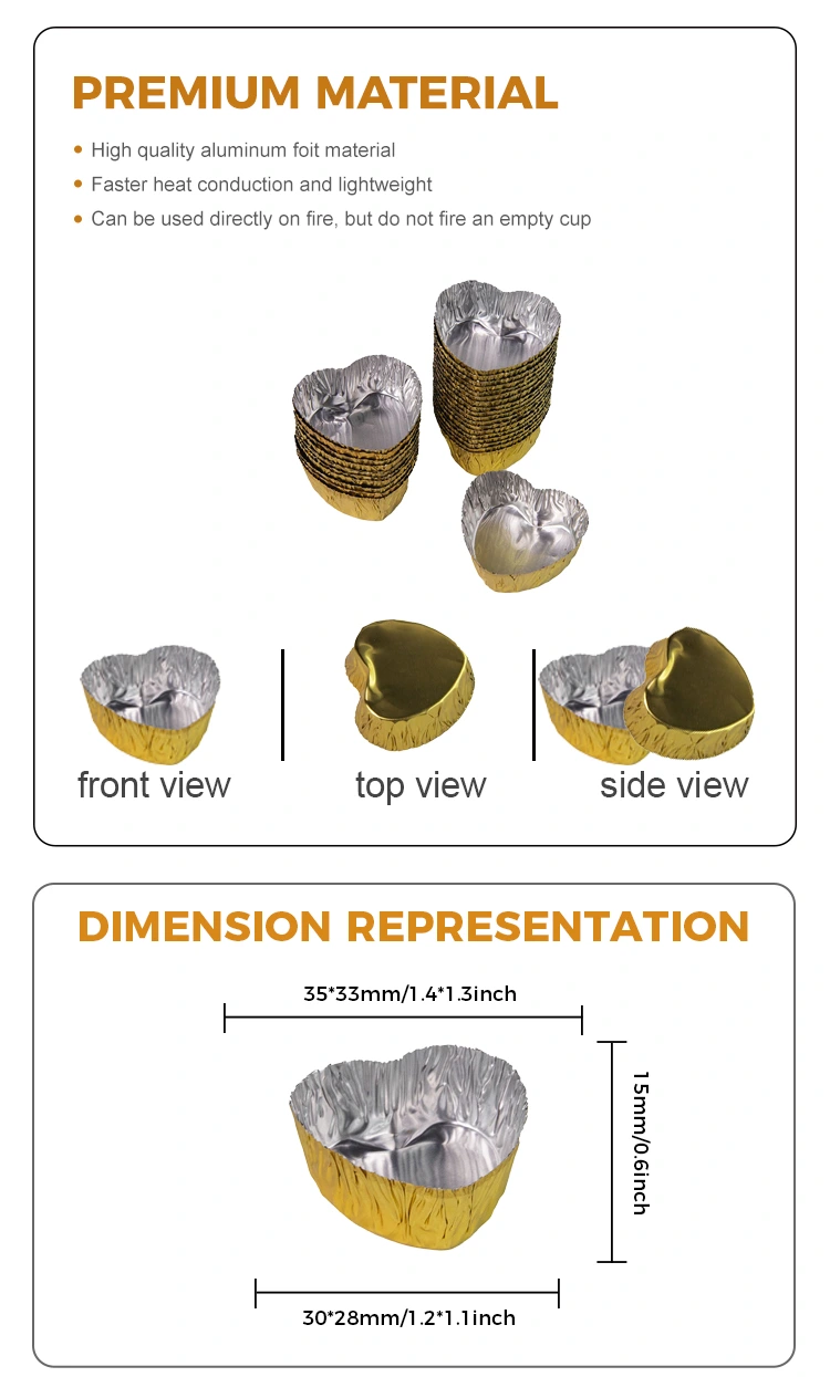 Юнчгу алюмінієва фольга постачальника серця у формі міні-запікання срібляста алюмінієва фольга з алюмінієвою фольгою з їжею дуже підходить для невеликої упаковки, застосування для випічки, унікального дизайну, серця дизайну, може зустрічатися з різноманітним використання Від ковзання та може підвищити стійкість до ковзання, можна налаштувати різноманітні кольори.