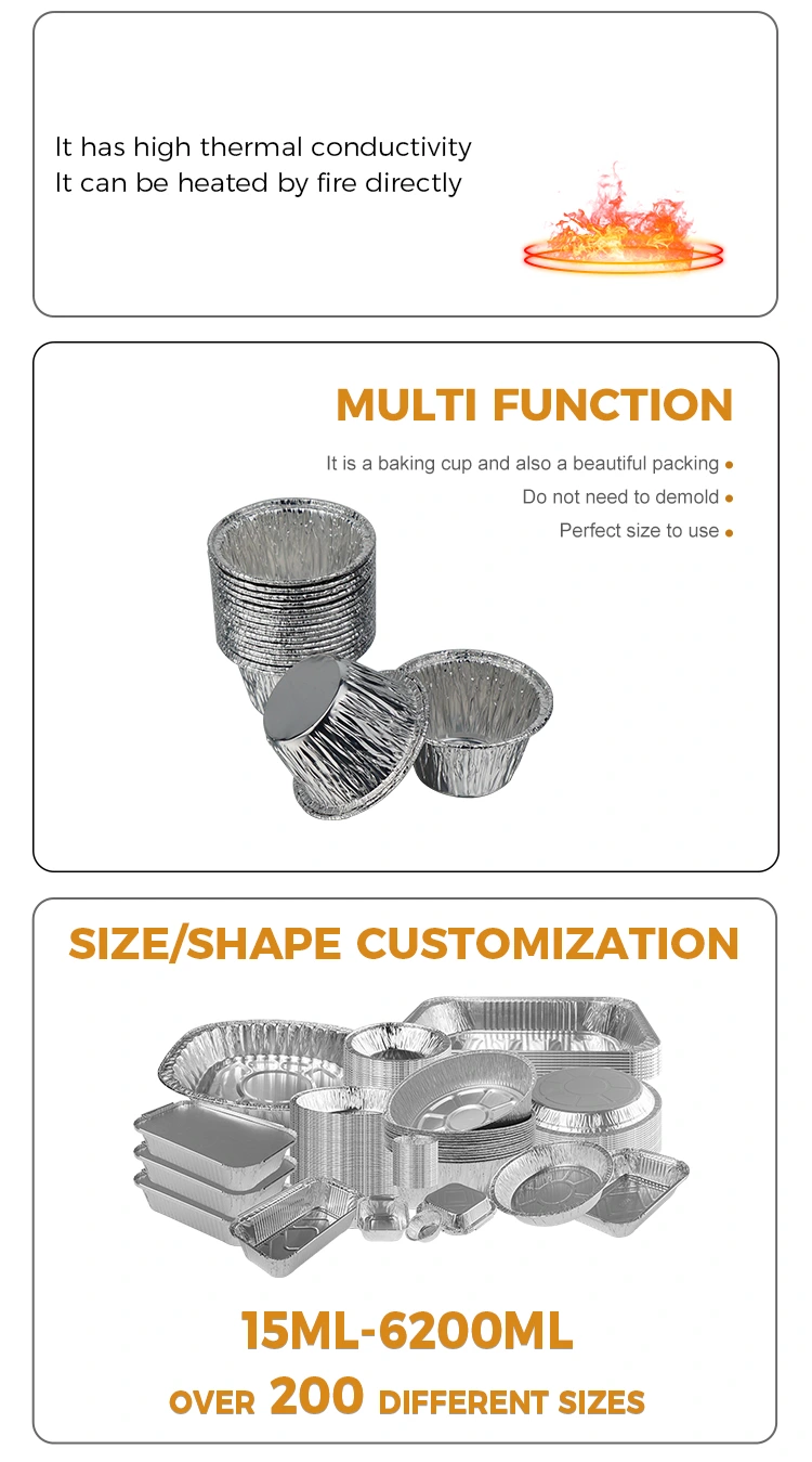 У срібному контейнері з алюмінієвої фольги Yunchu Aluminum Foil Manufacturer використовується харчова алюмінієва фольга 8011-O, яка пройшла сертифікацію FDA США щодо безпечності харчових продуктів і відповідає стандартам ЄС щодо безпеки матеріалів, що контактують з харчовими продуктами. Після професійної перевірки не має запаху та шкідливих залишків. Він може безпосередньо контактувати з усіма видами їжі. Його непросто деформувати або зламати. Він ефективно захищений від протікання та проти налипання. Він може безпосередньо утримувати рідкі інгредієнти, такі як тісто для торта, рідина для пудингу, соус тощо. Зовнішній закручений край має захист від подряпин, що зменшує ризик подряпин на руках. Діапазон температурної стійкості охоплює від -40 ℃ до 220 ℃, і його можна адаптувати до фритюрниць, духовок, пароварок і мікрохвильових печей (середньо-низький нагрів). Його можна помістити безпосередньо у фритюрницю для випікання міні-кексів і яєчних пирогів, а також використовувати для нагрівання заморожених інгредієнтів безпосередньо після розморожування, що відповідає різноманітним потребам у кулінарії та випічці.