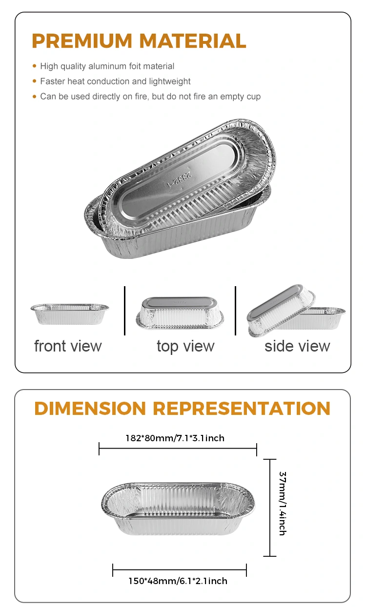 Постачальник алюмінієвої фольги з алюмінієвою фольгою овального повітряного фритюрниці Срібна алюмінієва контейнери з фольги - це тип контейнера, який можна використовувати для пропарювання, кипіння, випічки, випічки та інших цілей, і їх можна використовувати для соусів, соусів для занурень, невеликих приправ та зразків для випічки. Матеріал алюмінієвої фольги типу 8011-0, стійкість до розтягування та резистентність до корозії мають гарне подовження, потовщений матеріал з алюмінієвої фольги, міцний і непростий для розбиття за бажанням, підгортання, передня і задня конструкція напівкодула не шкодить рук, інтегрована ліплення, поверхня стіни така ж гладка, як дзеркало, багатий розмір, придатний для використання в різних сценаріях.
