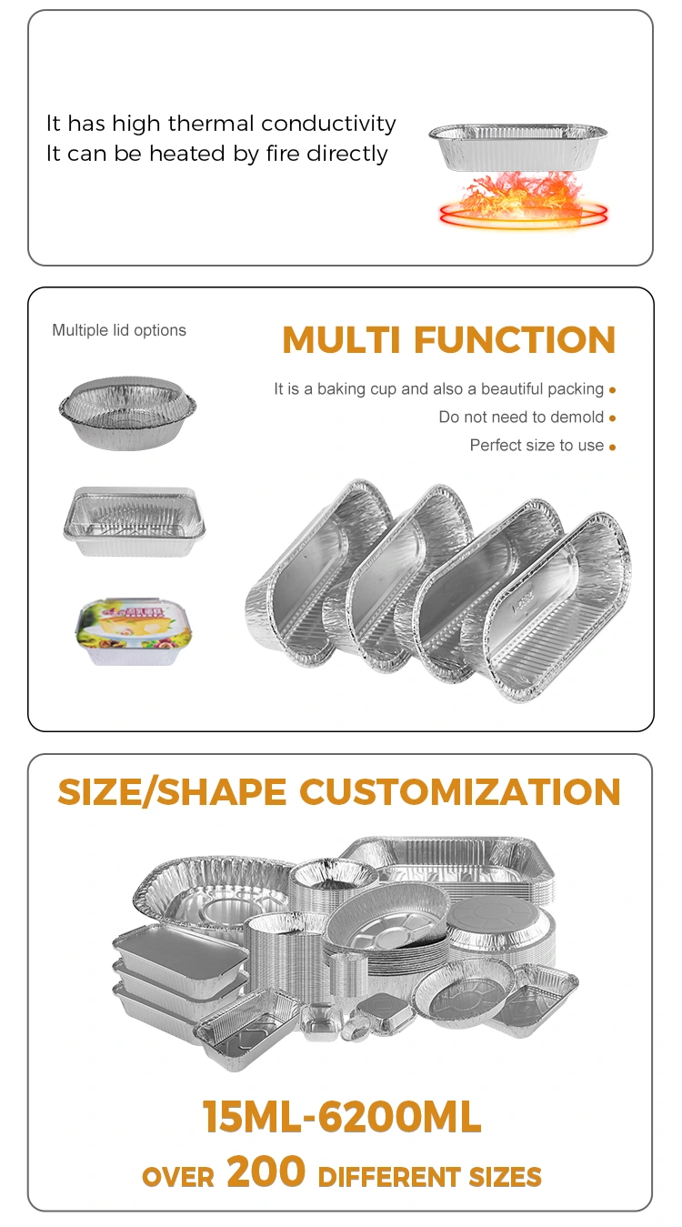 Постачальник алюмінієвої фольги з алюмінієвою фольгою овального повітряного фритюрниці Срібна алюмінієва фольга - це тип контейнера, який можна використовувати для пропарювання, кипіння, випічки, випічки та інших цілей, і може бути використаний для соусів, соусів для занурень, невеликих приправ та зразків для випічки. Матеріал алюмінієвої фольги типу 8011-0, стійкість до розтягування та резистентність до корозії мають гарне подовження, потовщений матеріал з алюмінієвої фольги, міцний і непростий для розбиття за бажанням, підгортання, передня і задня конструкція напівкодула не шкодить рук, інтегрована ліплення, поверхня стіни така ж гладка, як дзеркало, багатий розмір, придатний для використання в різних сценаріях.