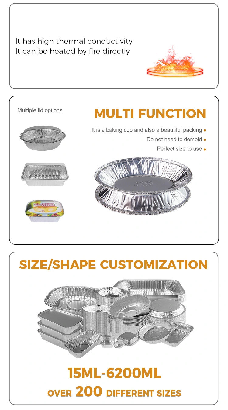 Особливості: цільна ліплення, потовщена та запечене стійке, прийняття матеріалу алюмінієвої фольги контакту з їжею, спокійно контактувати з їжею, непросто в деформі, а не протікати, сильну товщину, корозійну стійкість, високу температуру.