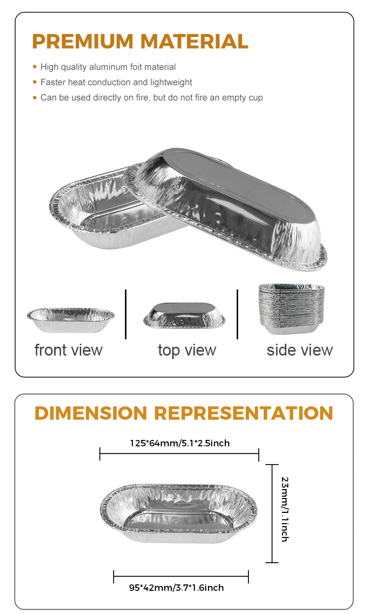 Контейнер для їжі на срібній фользі Юнчу овальної фальшивої - це дуже скромний розмір, з верхнім діаметром 125*64 мм (5,1*2,5 дюйма), базовим діаметром 95*42 мм (3,7*1,6 дюйма), висотою лише 23 мм (1,1 дюйма) та ємністю 105 мл (3,7 озовів). Цей розмір не тільки простий у перенесенні, але й може задовольнити різноманітні потреби в використанні.
