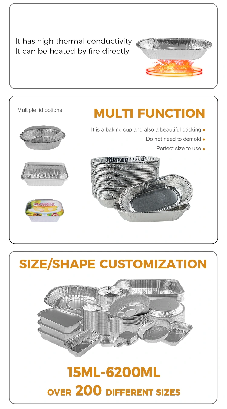 Завдяки своєму невеликому та легкому дизайну, цей контейнер для харчових продуктів з алюмінієвою фольгою з алюмінієвої фольги овально підходить для перенесення та зберігання їжі, підходить для використання та налаштування продуктів харчування в магазинах, ресторанах швидкого харчування тощо. Увімкнена та опукла дизайн текстури внизу допомагає посилити тертя та розподіляти тепло рівномірно та уникати локального перегріву. Крім того, коробка з алюмінієвої фольги була потовщена для поліпшення стійкості до стиснення та довговічності, і вона може залишатися стабільною навіть під час транспортування і нелегко деформується.