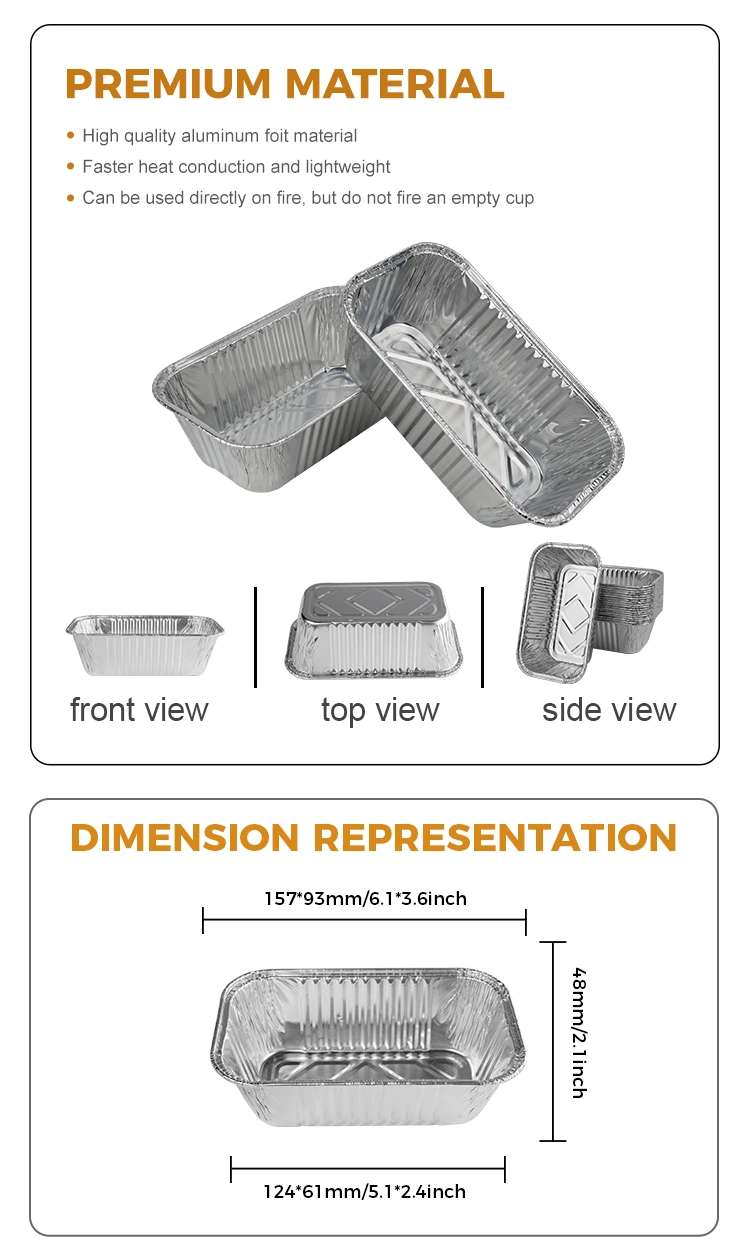 Алюмінієвий контейнер з алюмінієвою фольгою Юнгу-алюмінієвої фольги з алюмінієвою фольгою срібла підходить для різних випадків, таких як фритюрниця, випічка, винос громадського харчування, вечірки та майданчики для самообслуговування. Його можна використовувати для виготовлення продуктів харчування, таких як квадратний хліб, запечені печиво, грилі та фритюрниця, і його можна використовувати з різноманітними продуктами харчування. Маючи потужність 450 мл, цей контейнер здатний утримувати більшість харчових продуктів і має повністю прозору кришку з фольги для домашніх тварин, щоб ефективно запобігти потраплянню пилу та інших забруднень. Гладкі зовнішні стіни полегшують укладання та зберігання, заощаджуючи простір. Це безпечно та здорово у використанні, і він дуже екологічно чистий, а матеріал підлягає переробці, що робить його легким для перевезення та повторного використання.