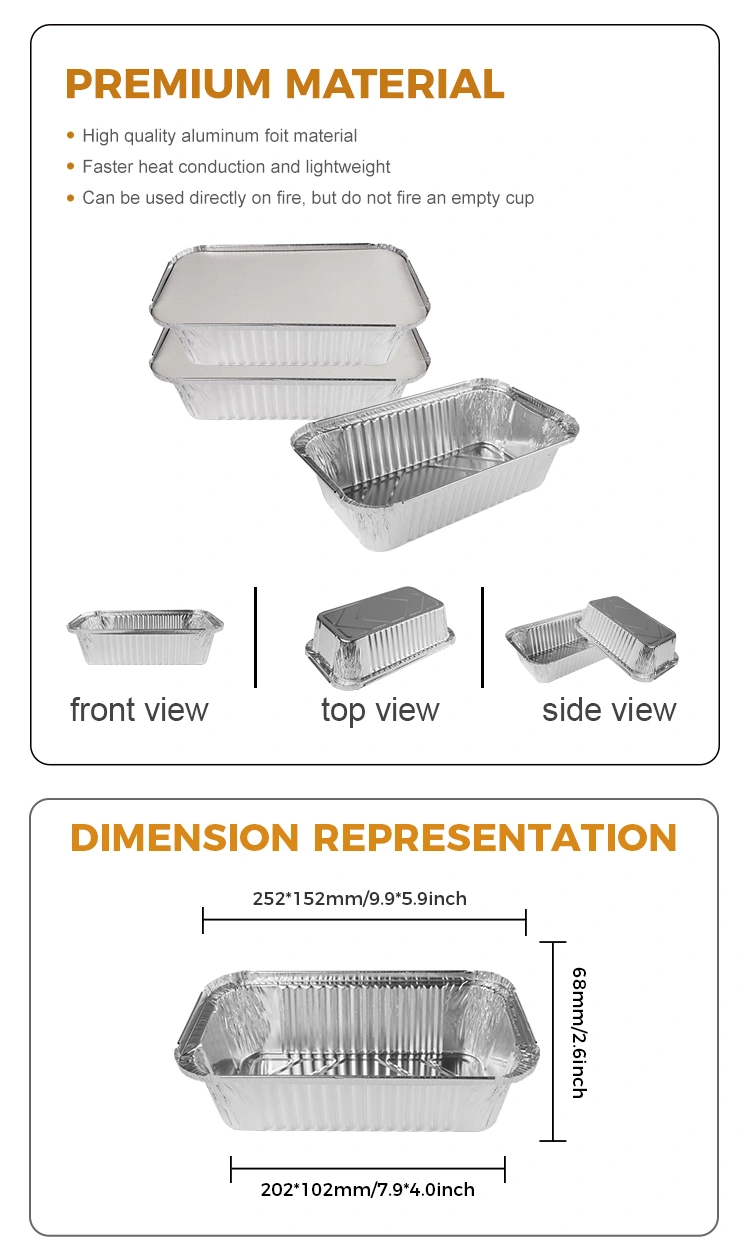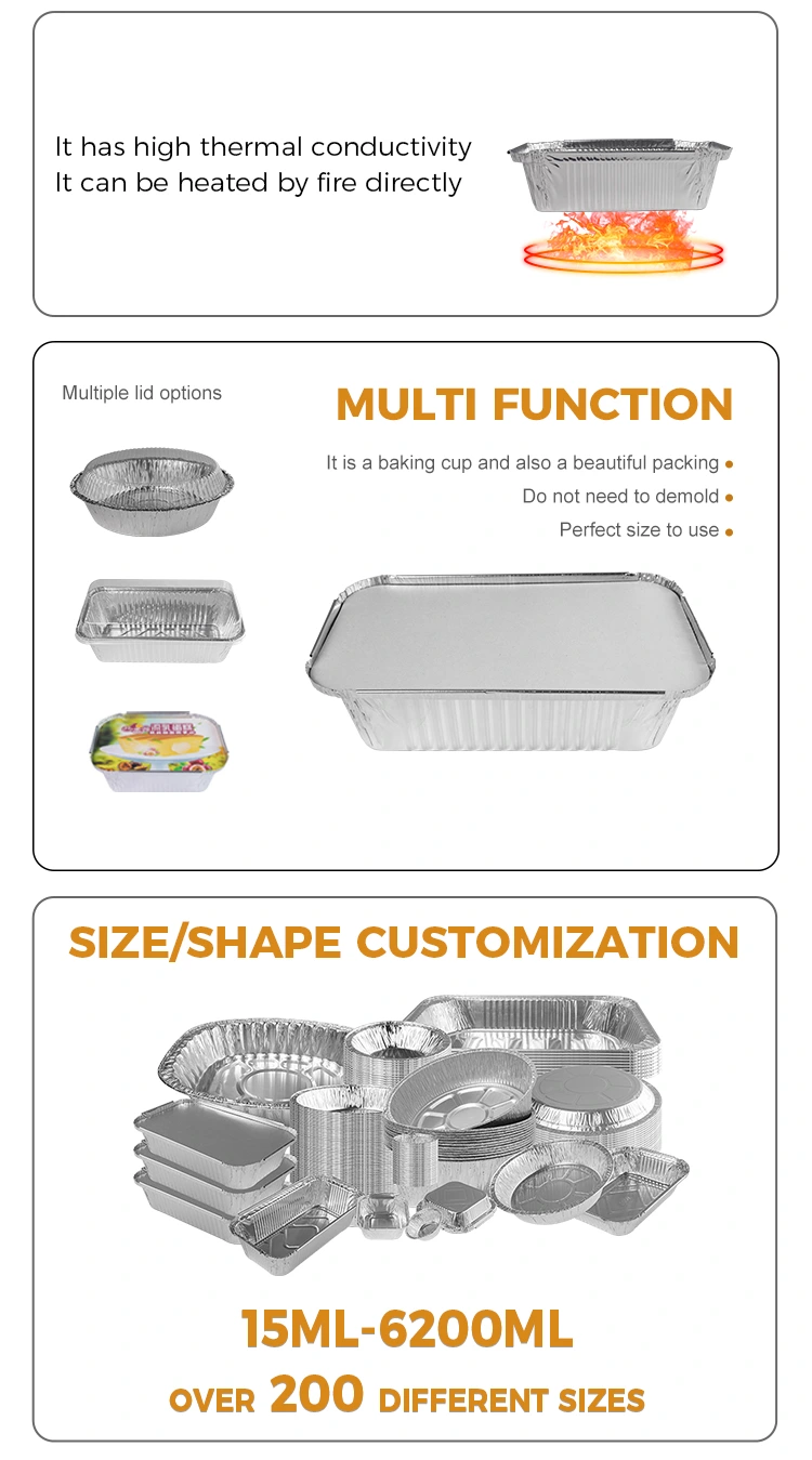 Алюмінієва фольга на Юнчу. Ця прямокутна фритюрниця, що упаковує сріблясті алюмінієвої фольги, виготовлена ​​з високоякісного 8011 алюмінієвого матеріалу з алюмінієвої фольги, який має відмінні продуктивності теплоізоляції і може ефективно підтримувати температуру їжі, що робить їжу більш смачною та смачною. У той же час, наша прямокутна контейнер з алюмінієвої фольги срібла також оснащена функцією збереження тепла, яку можна досягти, узгоджуючи його з кришкою з алюмінієвою фольгою або пластиковою кришкою для домашніх тварин, що зручно для налаштованого логотипу і, таким чином, розширює зображення бренду.