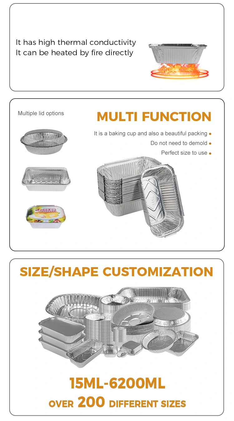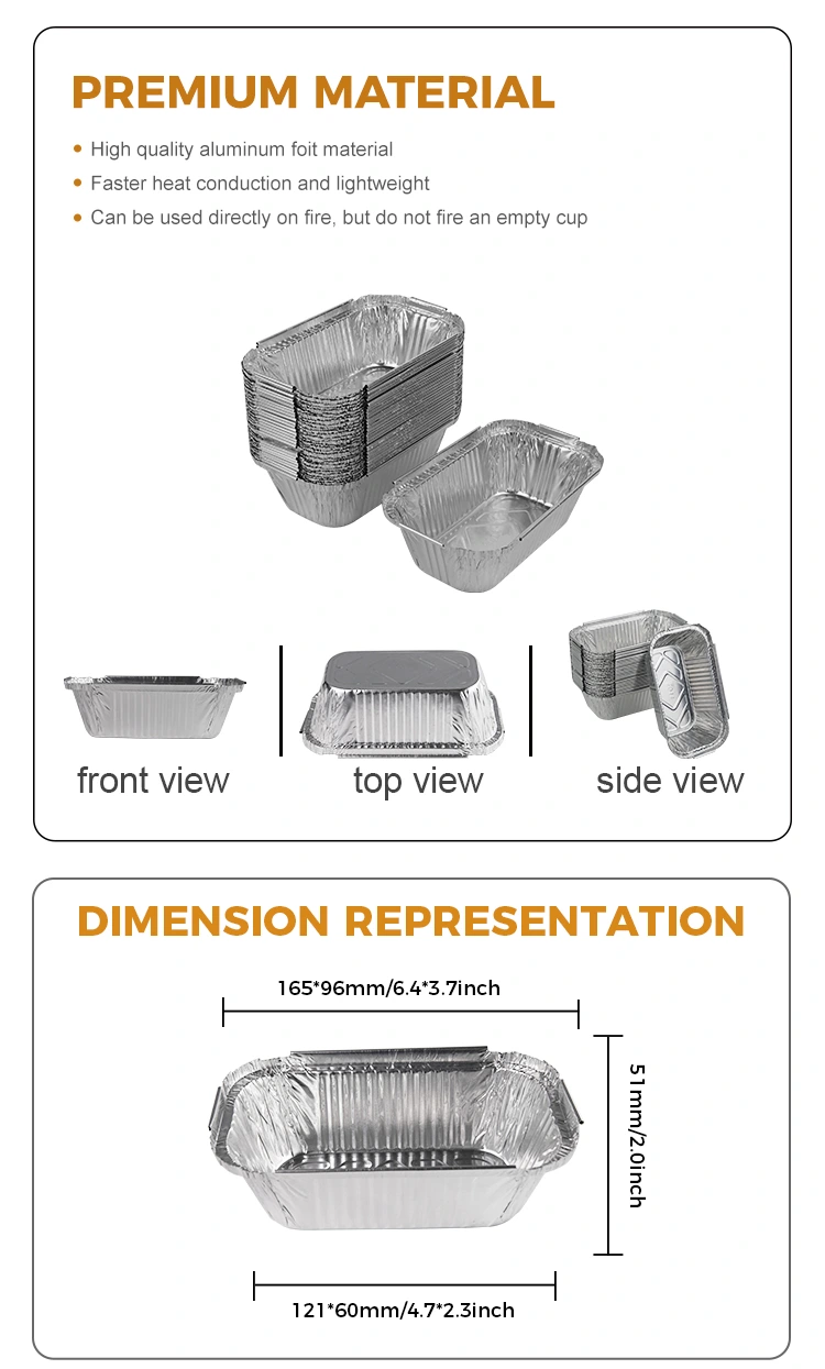 ОСОБЛИВОСТІ: Коробка обіду з алюмінієвою фольгою, яку ми надаємо, виготовляється з 8011 алюмінієвого матеріалу фольги, який має відмінні показники збереження тепла і може ефективно підтримувати температуру їжі, що робить вашу їжу більш привабливою. Зокрема, наші прямокутні контейнери з алюмінієвої фольги з рисою срібла мають не лише властивості теплоізоляції, але й можуть поєднуватися з кришками з алюмінієвої фольги або пластиковими кришками для домашніх тварин для полегшення персоналізованої налаштування логотипів, тим самим покращуючи точки пам’яті клієнтів та підвищення поінформованості про бренд.