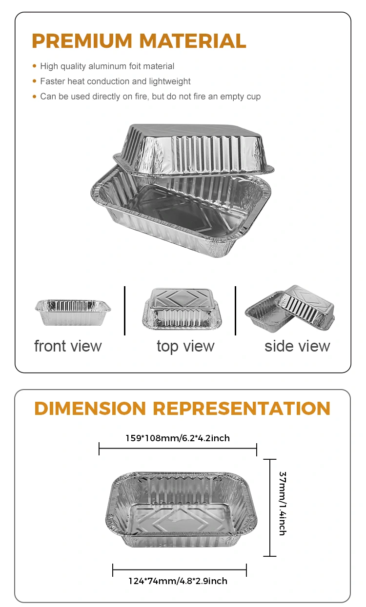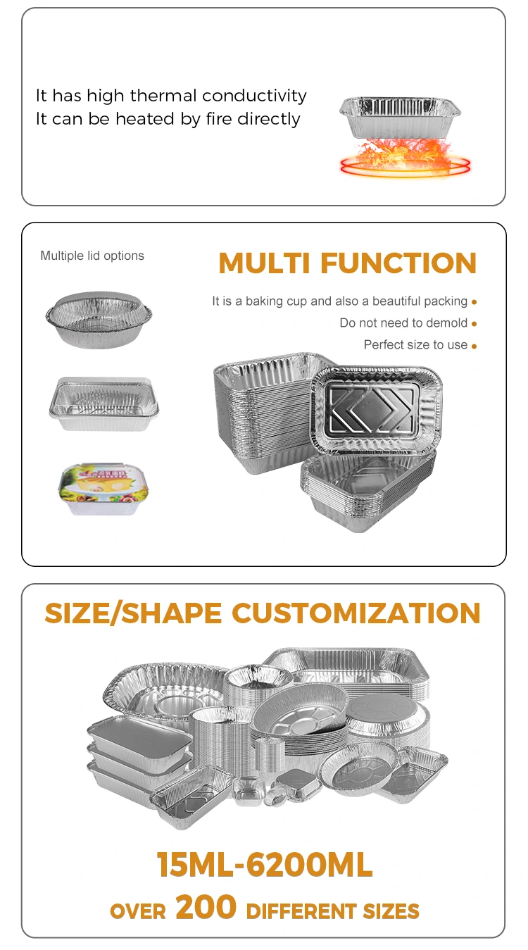 Цей квадратний контейнер з алюмінієвої фольги з алюмінієвою фольгою виготовлений з алюмінієвої фольги з алюмінієвою фольгою, гарантуючи, що продукт не містить запаху та повністю відповідає стандартам безпеки харчових продуктів.