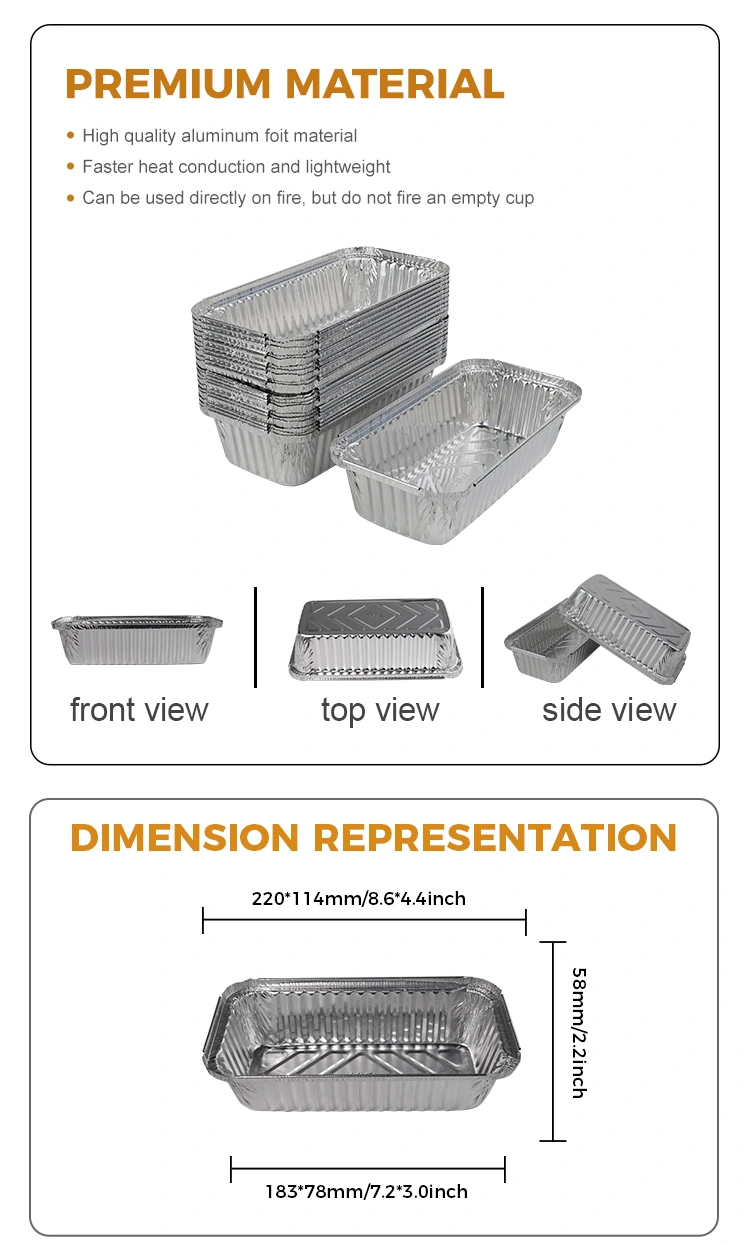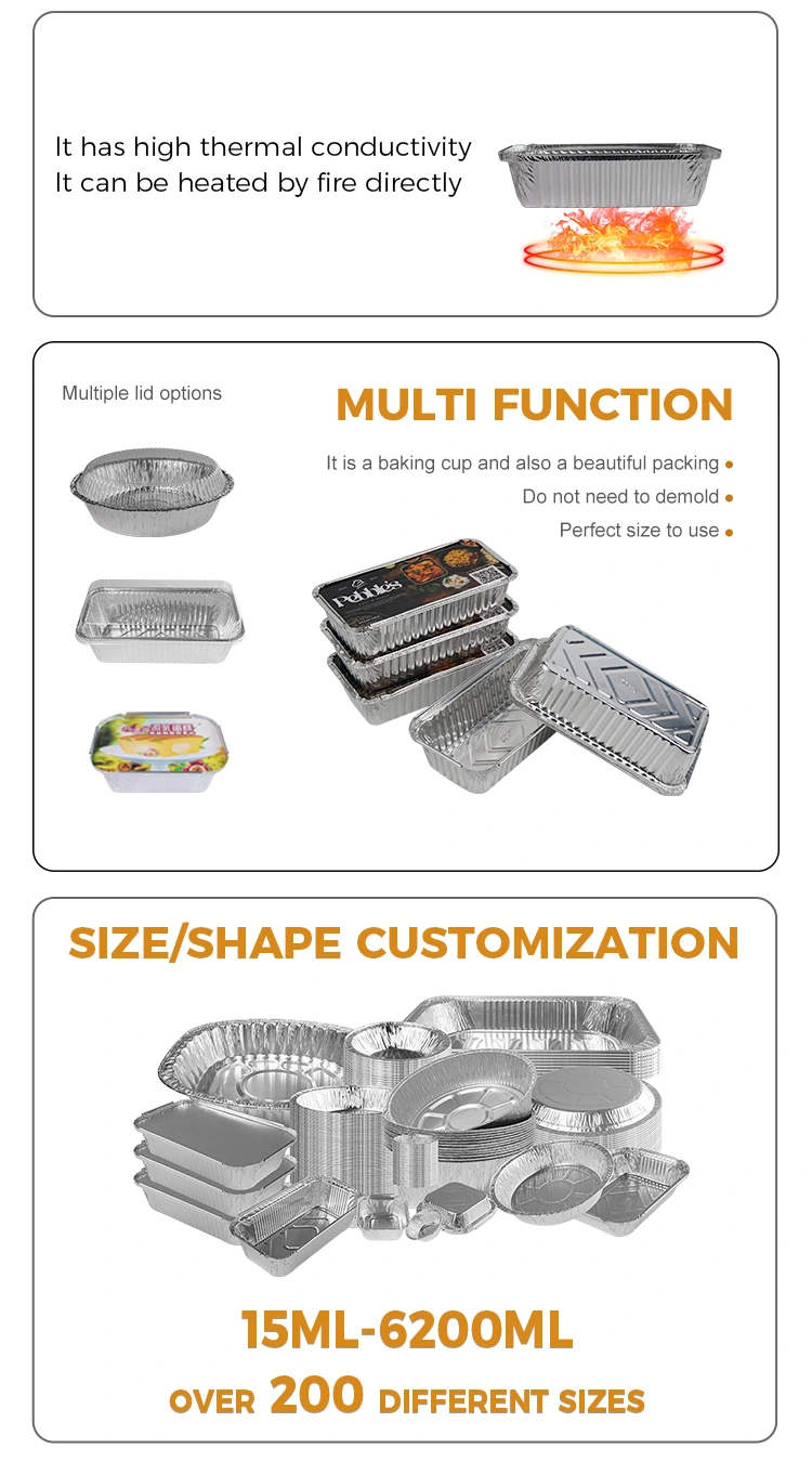 Постачальник алюмінієвої фольги з алюмінієвою фольгою, потовщені контейнери з алюмінієвої фольги срібла, є хорошим помічником для барбекю, гарячою горщиком, випічкою, упаковкою для виїзду, різноманітними навичками приготування їжі можна робити в коробці, різні розміри підходять для різноманітних горщиків та тощо. А стійкість до масла, легка випічка, барбекю на відкритому повітрі, тимчасові миски не бояться вогню при використанні, потрібно розмістити їжу або суп, не сушити без води, побутові печі чисті та зручні для утилізації страв.