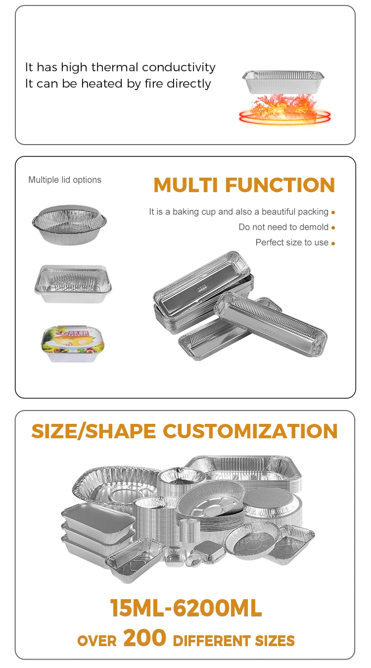 Особливості: Оптова коробка для обіду виготовлена ​​з 8011 алюмінієвого матеріалу з фольги, який має хороший ефект збереження тепла і може підтримувати температуру їжі, що робить їжу більш смачною та смачною. Крім того, наш прямокутний контейнер з алюмінієвою фольгою срібла також має функцію теплоізоляції і може відповідати кришці з алюмінієвою фольгою та пластиковою кришкою.