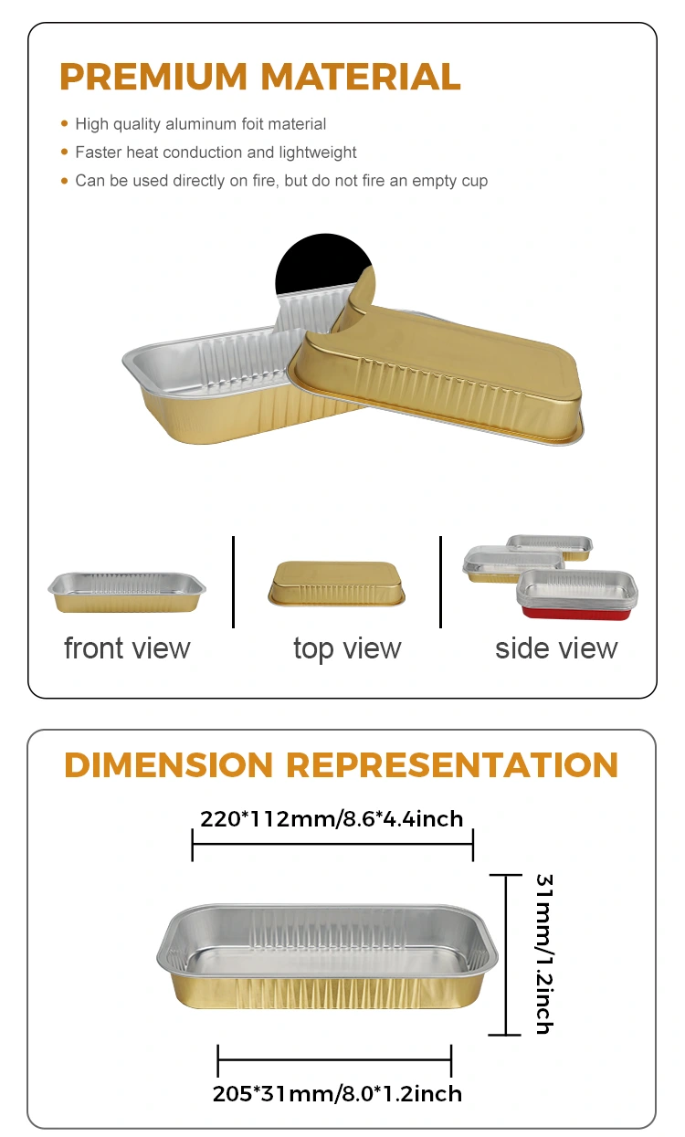 Алюмінієва фольга Yunchu є виробником і постачальником прямокутних золотистих контейнерів з гладкою стінкою з алюмінієвої фольги, виготовлених із харчового матеріалу 8011-0. Він підходить для різноманітних сценаріїв, таких як шашлики, випічка, сімейні обіди, кемпінг і винос. Цей контейнер може не тільки задовольнити потреби щоденної випічки та іншої їжі, але також продемонструвати широкий діапазон продуктивності цього продукту в різних громадських місцях. Після суворого відбору продуктів нашої компанії герметичність цього контейнера була широко визнана торговцями, і він також може бути герметичним у галузі виносу.