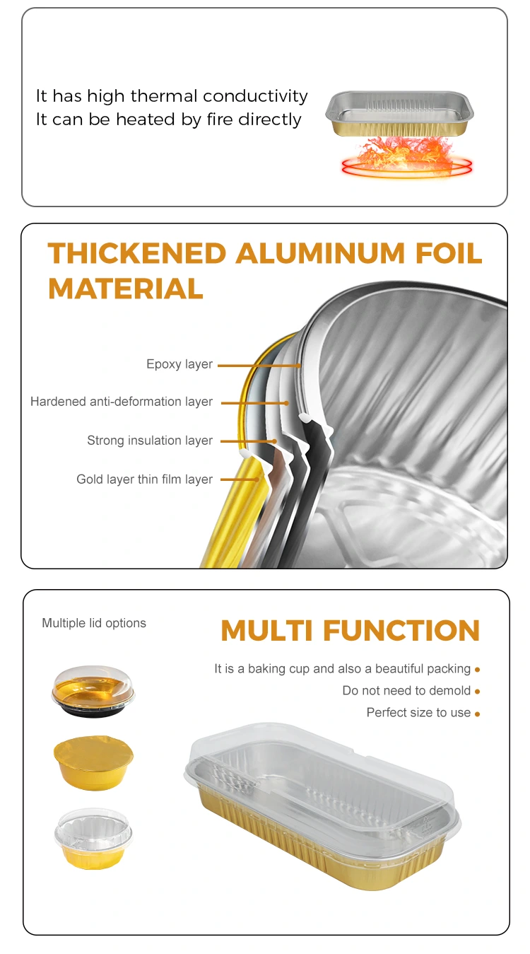 Чудова теплопровідність матеріалу з алюмінієвої фольги дозволяє швидко та рівномірно передавати тепло духовки всередину страви, уникаючи локальних проблем, пов’язаних із підгорянням або затисканням. Під час випікання довгої випічки корпус коробки щільно прилягає до форми страви, утримуючи вологу та аромат. При запіканні зовні виходять хрусткими, а всередині м’якими. Смак набагато кращий, ніж у звичайної скляної або пластикової тари. Краї коробки закруглені, що стійко до подряпин і ефективно запобігає витіканню супу. Контейнери з гладкою стінкою з алюмінієвої фольги прямокутного золотистого кольору підходять для запікання делікатесів із соусами (таких як батончики лава-шоколаду, булочки з карамельними горіхами).