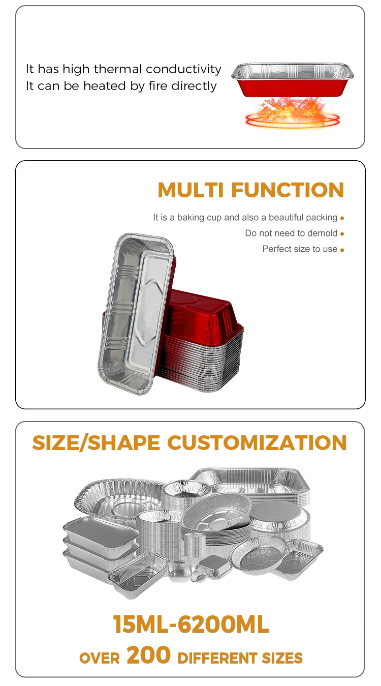 Контейнери з алюмінієвої фольги Yunchu Rectangular Red Bakery Catering Silver з алюмінієвої фольги мають міцну конструкцію, безпечну для духовки. Вони залишаються стабільними навіть за високих температур і відкритого вогню, витримуючи температуру вище 220 ℃, забезпечуючи рівномірний розподіл тепла, щоб запобігти опіку, і пропонуючи міцне ущільнення, щоб зафіксувати свіжість (запобігаючи появі повітря та вологи, зберігаючи хліб м’яким навіть після охолодження). Вони також пропонують екологічні та естетичні переваги. Виготовлені з харчової алюмінієвої фольги, вони відповідають стандартам переробки упаковки та можуть бути перероблені через законні канали після утилізації, зменшуючи екологічний тягар одноразових пластикових контейнерів. Подовжена форма точно відповідає розмірам батонів, зберігаючи форму тіста та запобігаючи розширенню та деформації під час випікання. Це гарантує, що хліб збереже свій неушкоджений подовжений вигляд після випікання, що призводить до більш привабливого вигляду продукту, що особливо підходить для комерційних установ.