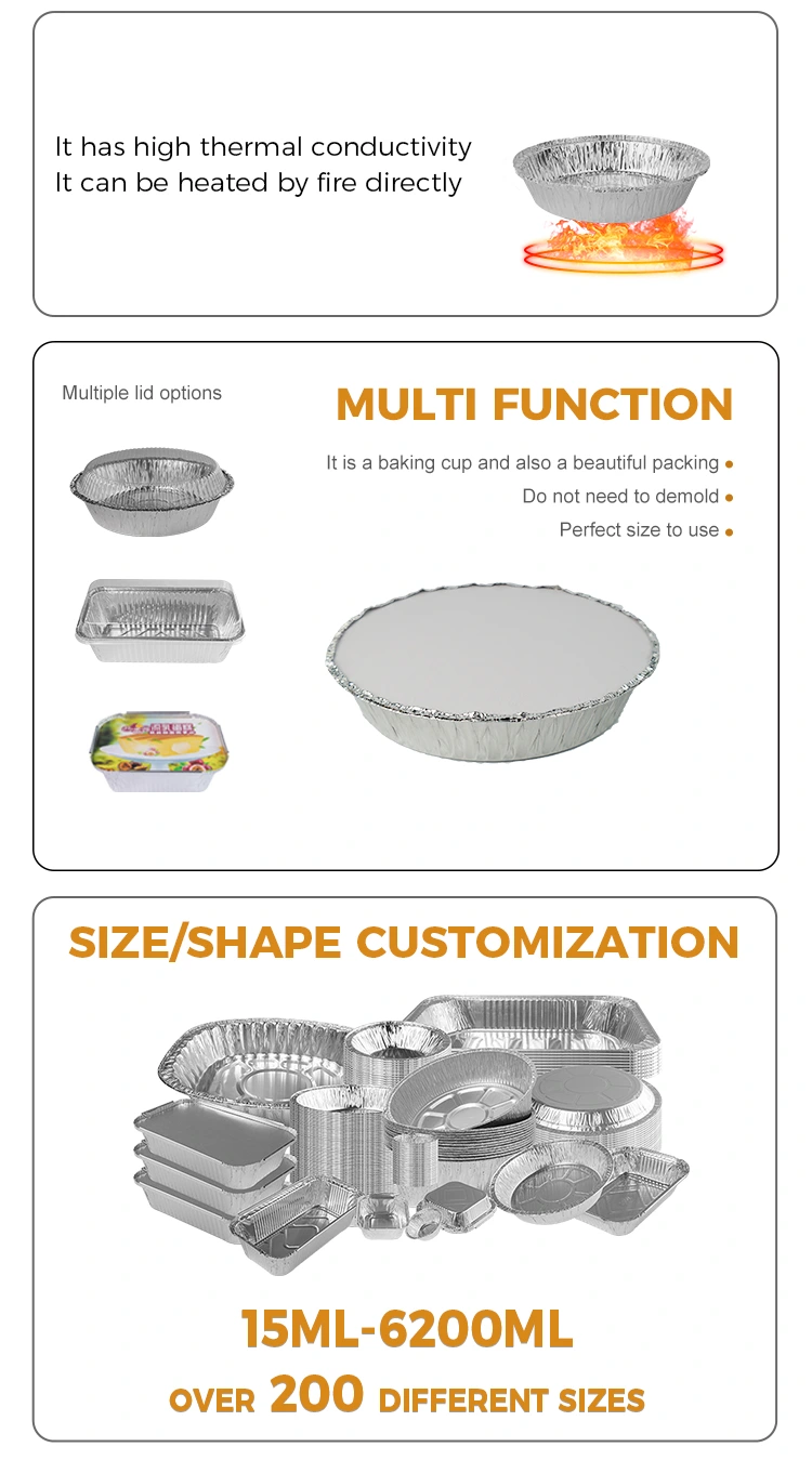 Контейнери з алюмінієвою фольгою з алюмінієвої фольги з алюмінієвою фольгою з алюмінієвої фольги є унікальною на ринку з його чудовими характеристиками продукту. Цей контейнер проводить рівномірно тепло і не горить легко, гарантуючи, що їжа була рівномірно та готується смачною та безпечною їжею. Його стійкі до масла та стійкі до плям властивості полегшують депозицію, з плісированою формою навколо нього для легкого доступу та закругленим і гладким дном, який можна швидко розбити лише легкою кнопкою. Викиньте його після використання, не потрібно чистити, що безтурботно і гігієнічно. Цей контейнер має велику ємність і може утримувати кілька інгредієнтів одночасно, що робить його придатним для різних потреб у випічці. Незалежно від того, чи це випічка пирогів, тортів чи виготовлення яєчних жовток, торти з чаші, барбекю та інші делікатеси, це універсальний вибір.