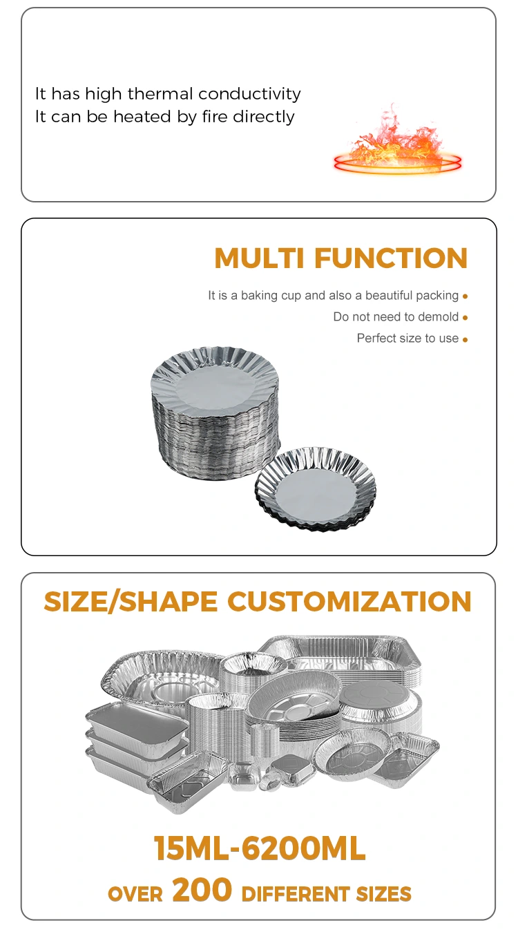 Олово для випічки з випічкою з контейнером для їжі з алюмінією з алюмінієвою фольгою, наданою постачальником алюмінієвої фольги Юнь Чу, мають дуже продуманий дизайн. Вони мають кругову форму та помірний розмір, придатний для виготовлення різних видів випічки, а також полегшують різання та прикрасу. Більше того, товщина науково обчислюється, щоб забезпечити достатню підтримку, щоб утримувати їжу на місці, запобігаючи надмірному тиску, який може спричинити деформу або тріщини їжі.