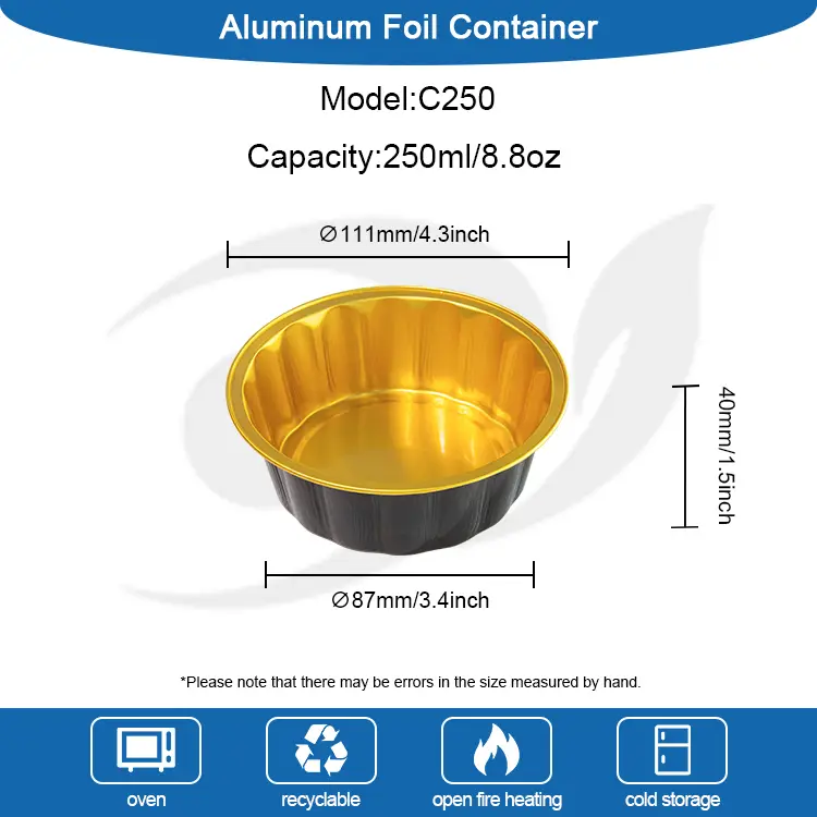Постачальник алюмінієвої фольги з алюмінієвою фольгою для десертів для десертів гладкої стінки алюмінієвої фольги C250-це багатофункціональний продукт, призначений для випічки, харчування тощо. Елегантний, округлий, увігнутий та опуклий дизайн стін не тільки підвищує практичність, але й підвищує зовнішній вигляд продукту, і існує різноманітні прозорі та кришки фольги, щоб забезпечити рівномірне опалення та не ковзаючі продукти харчування.