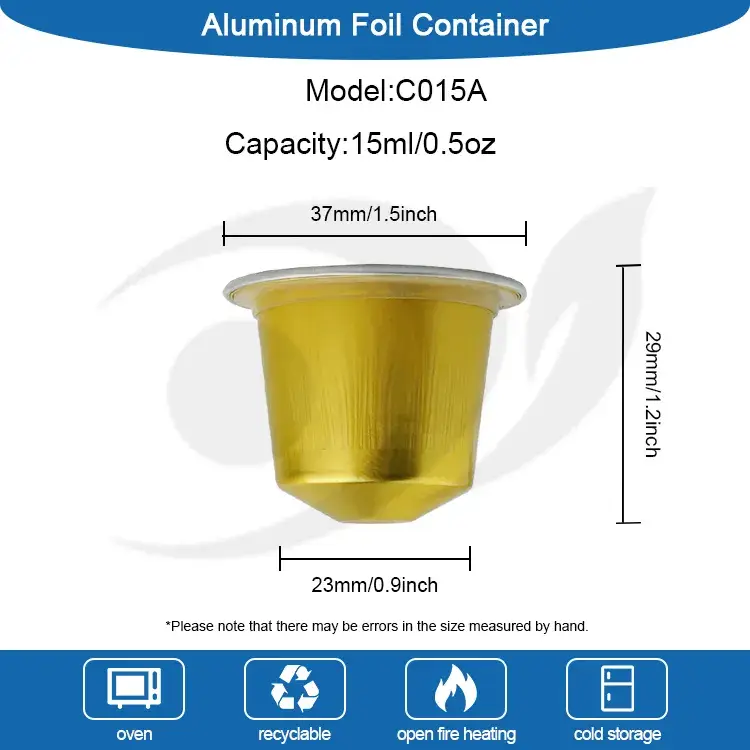 Постійна кави з алюмінієвою фольгою Yunchu Silicone-Seal Capsule C015A у таких розмірах: верхній діаметр 37 мм (приблизно 1,4 дюйма), базовий діаметр 23 мм (приблизно 0,9 дюйма), висота 29 мм (близько 1,1 дюйма). Ця капсула містить 15 мл (близько 0,5 унцій) меленої кави, кави. Підходить для всіх машин Nespresso, упакованої еспресо -рідини і навіть може бути розширений за допомогою промивання азоту. Крім того, логотип та колір також можна налаштувати, а візерунок можна надрукувати на обкладинці алюмінієвої фольги, а логотип також можна штамувати в нижній частині капсули кави.