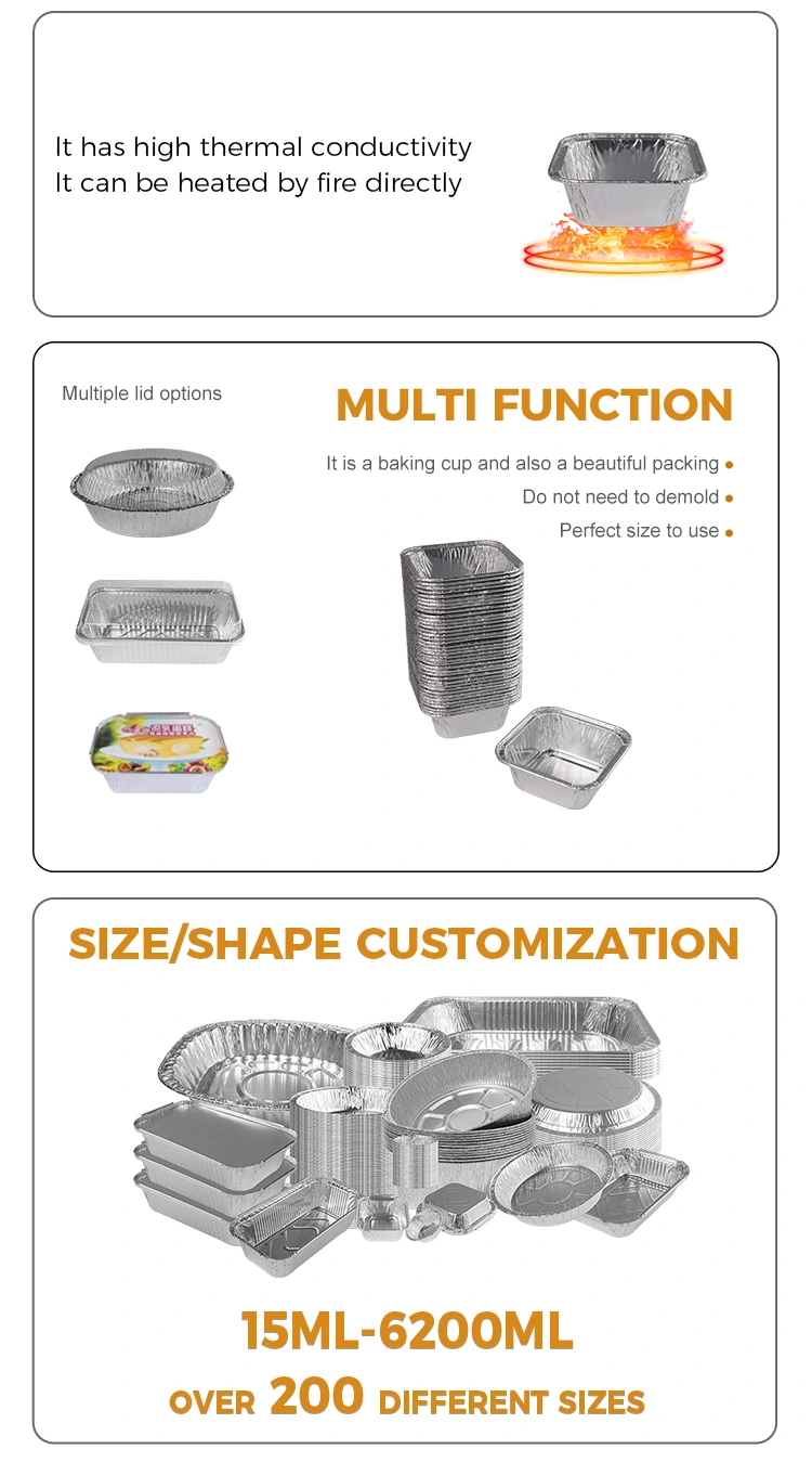 Контейнер з алюмінієвою фольгою з квадратного повітря фритюрниці використовує високоякісний матеріал алюмінієвої фольги, який є і легким, і міцним. Верх можна налаштувати за допомогою прозорої кришки домашніх тварин, а внизу має кришку, яка стискається і закріплюється в коробці, щоб запобігти прилипанні їжі до випічки, який легко випускати та чистити, а також простий у транспорті та вживанням.